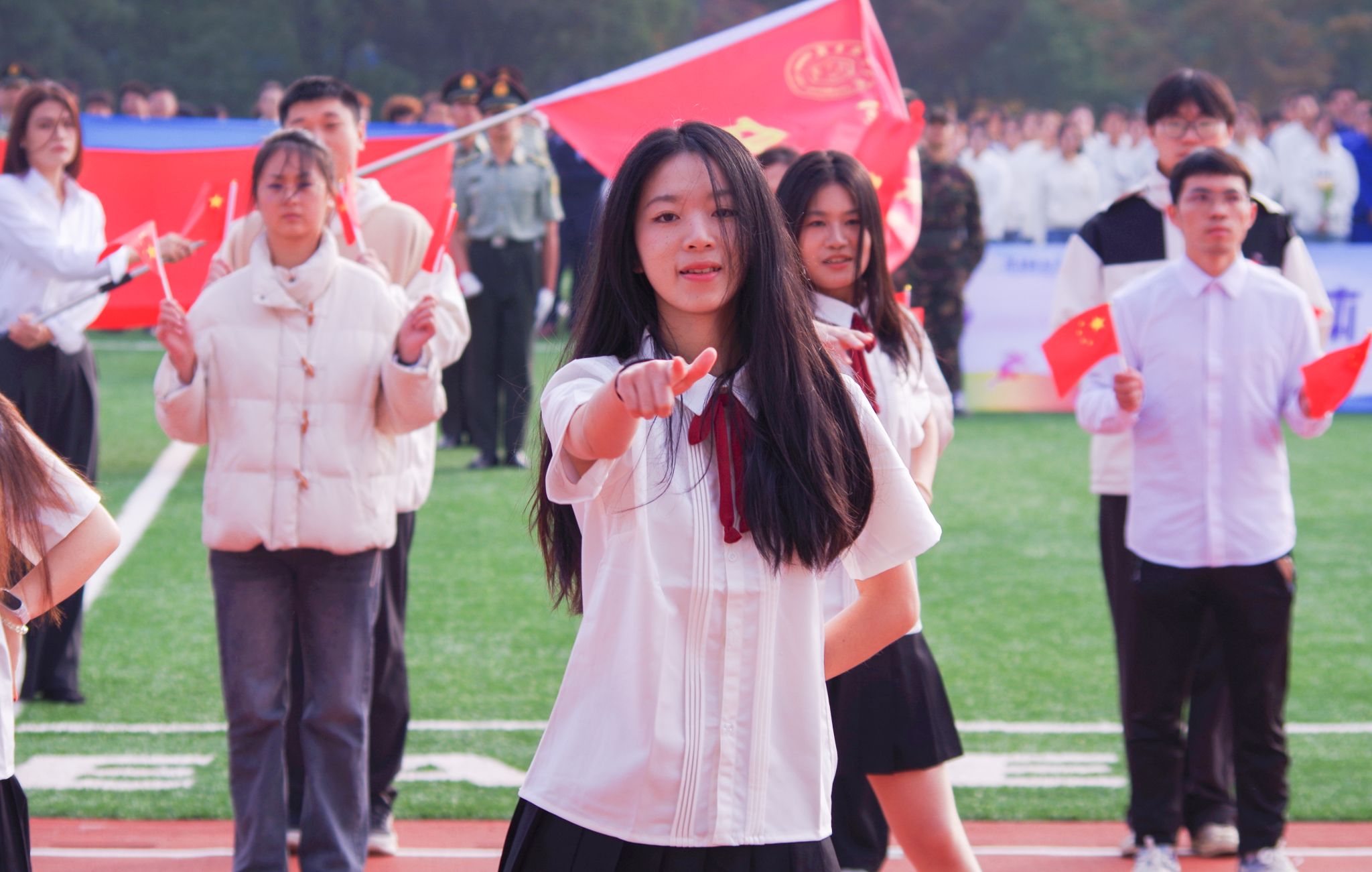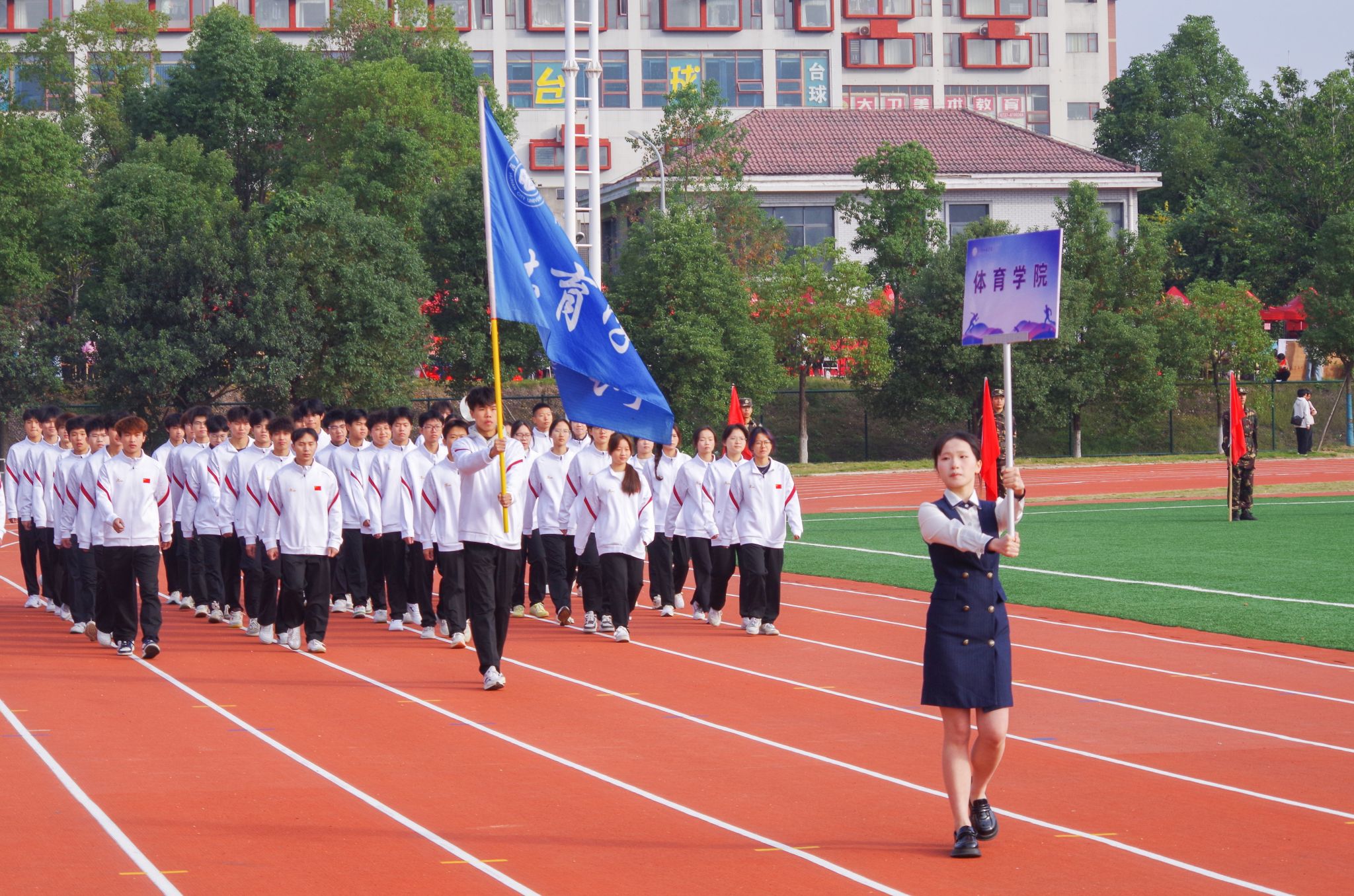 本次运动会以“阳光体育,靓丽青春”为主题,上午8时整,伴随着激昂的《运动员进行曲》,四名旗手高擎五星红旗,引领入场队伍稳步迈进,紧随其后的是校旗校训方阵、教导队方阵、裁判员方阵、志愿者方阵、各二级学院运动员代表方阵,他们信心百倍、精神抖擞,迈着整齐的步伐,阔步走向主席台,豪迈自信的声音响彻整个田径场上空。