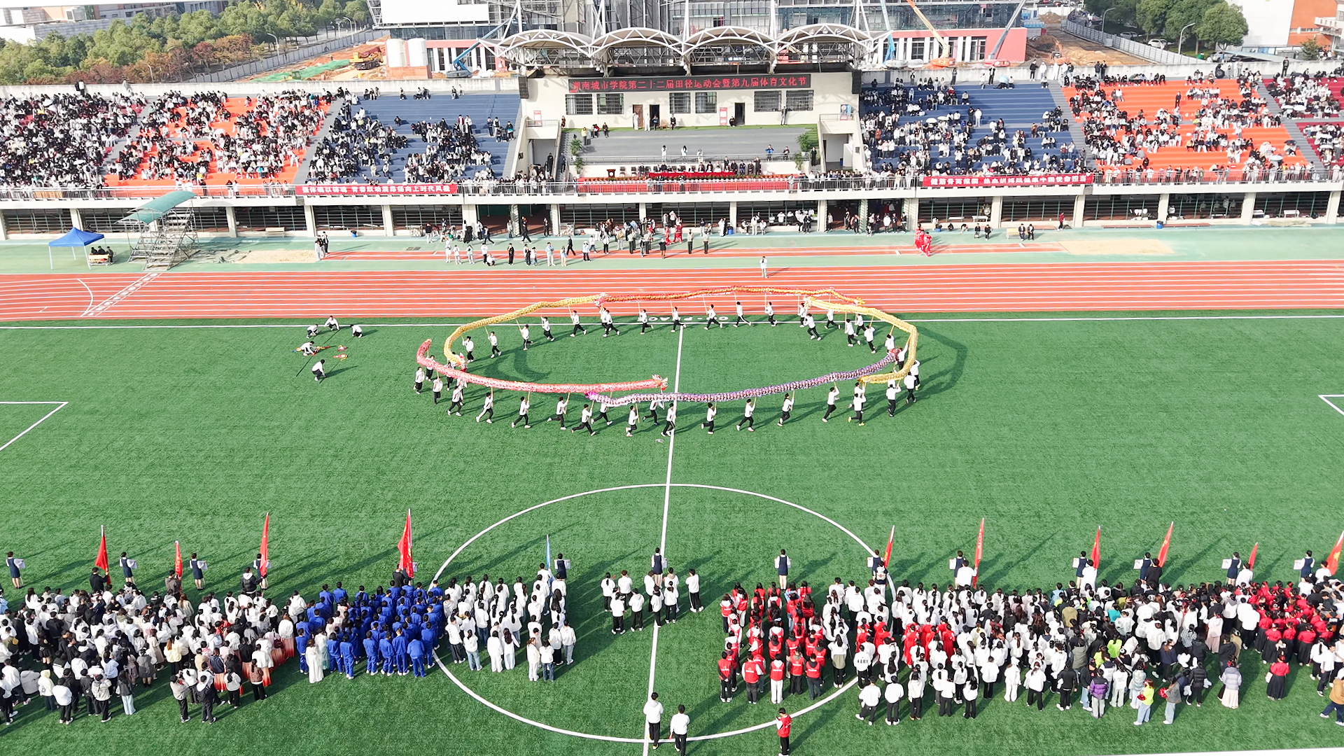 在入场式中,各二级学院运动员们还为现场观众献上了一场精彩纷呈的视觉盛宴。马克思主义学院的学子们执绸扇而来,以“赤韵”为热血注色,以“象行”铸拼搏之姿惊艳全场。管理学院带来的舞蹈《九州同》,将古典的底蕴与青春的脉搏同频,大气的力量与柔美的韵致交融,她们身穿一袭赤衣,如旭日映山河,手执一把长扇,似长风卷云霄。音乐与舞蹈学院带来舞蹈《sunshine》,她们用流畅线条勾勒活力,明快节奏传递热诚。其余13个学院也带来了精彩绝伦的表演,赢得了师生一致好评,现场欢呼与掌声交织在一起,持久不断。