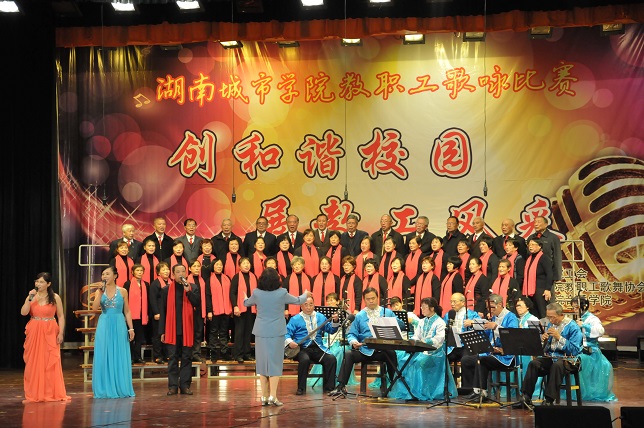(本网讯)“创和谐校园、展教工风采”, 11月25日晚7点,随着离退休教师们的《湖南民歌联唱》盛装开场,由校工会主办,教职工歌舞协会、音乐学院协办的教职工歌咏比赛在音乐学院音乐厅拉开帷幕。各分工会精心组织节目,参赛选手们盛装打扮,倾情演出,或深情悠扬,或高亢激昂,动听的歌声不时引起现场观众如雷般的掌声。