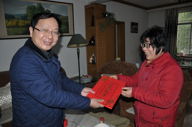 在重病、特困教职工家中,校领导了解他们的治疗情况和有关困难,鼓励他们积极配合治疗,渡过难关,感谢他们的家人的悉心照料,并祝他们及家人春节愉快。