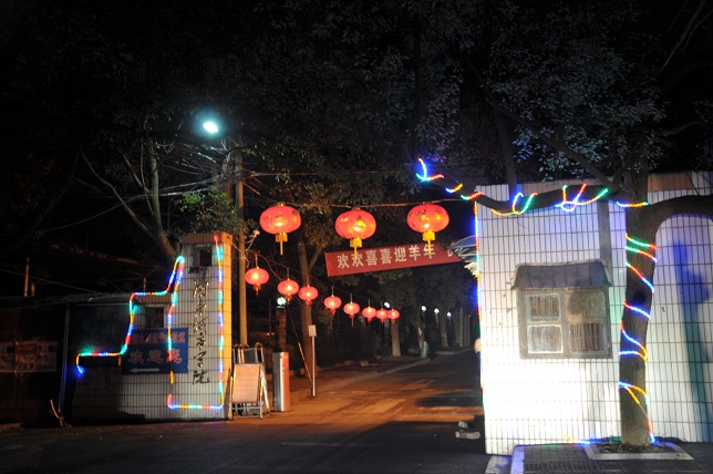 上午,宣传部布置完成了节日校园美化工作。校园内、家属区,大红的灯笼,闪烁的彩灯,红红的横幅,把整个校园区、家属区装饰得“年味儿十足”。