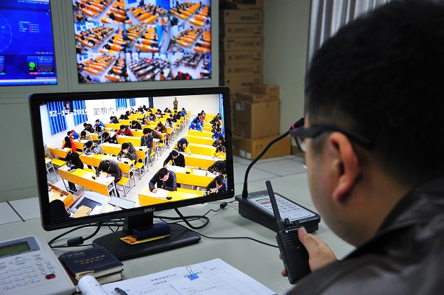 监控人员通过高清监控查看考场情况