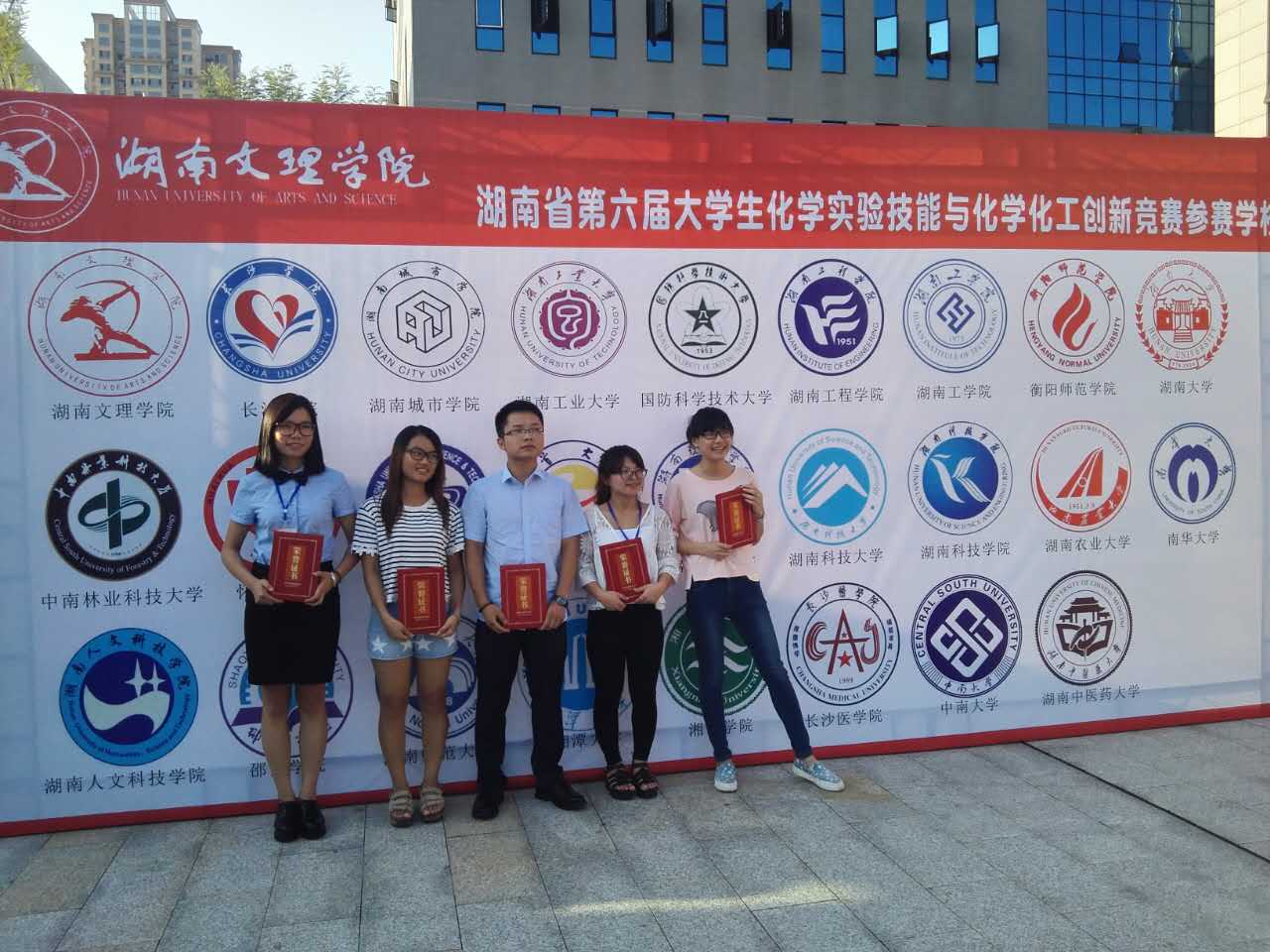 (本网讯)2016年7月26日, “湖南省第六届大学生化学实验技能竞赛”和“湖南省首届大学生化学化工创新作品竞赛”在湖南文理学院举行。我校3名参赛选手在“湖南省第六届大学生化学实验技能竞赛”中均获一等奖,2件参赛作品在“湖南省首届大学生化学化工创新作品竞赛”中均获二等奖。