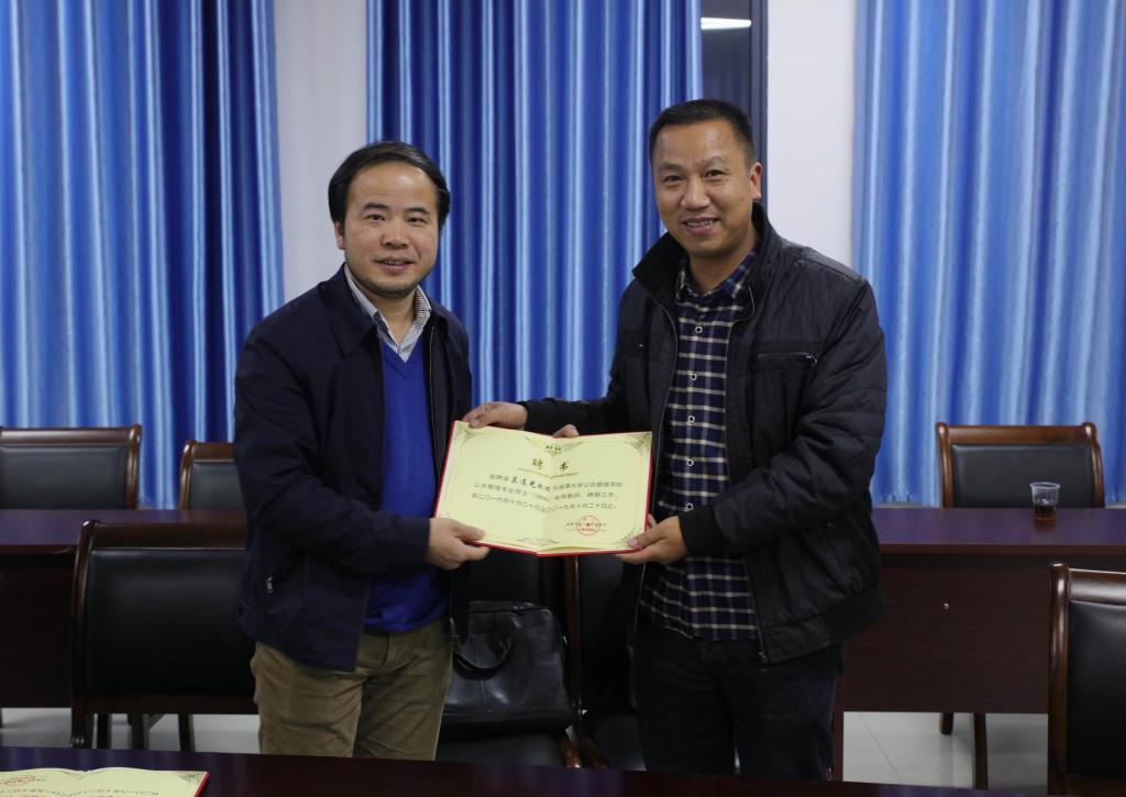 会上,盛明科代表湘潭大学为我校薛姝、莫连光、赵旭、张卫枚颁发专业硕士导师聘书,并介绍了该校公共管理学院的基本情况、学位设置以及招生和培养情况。