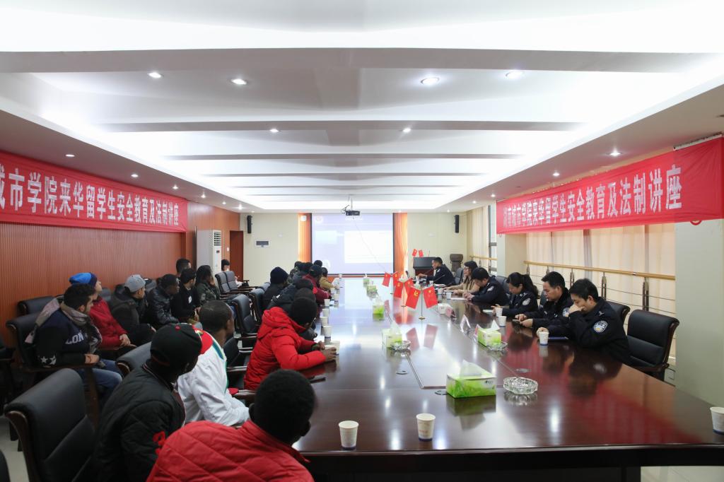 (本网讯)12月13日下午,我校来华留学生安全教育与法制讲座在办公楼一会议室举行。副校长刘辉煌,益阳市公安局人口与出入境管理支队副支队长郭胜、大队长张强、外管专干彭娟、市公安局朝阳分局人口大队大队长邹亮、副大队长唐一波,我校文学与新闻传播学院负责人、国际交流处全体人员以及来自加纳、也门和加拿大目前在校的22名来华留学生参加。讲座由国际交流处处长周桂平主持。