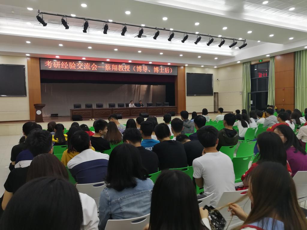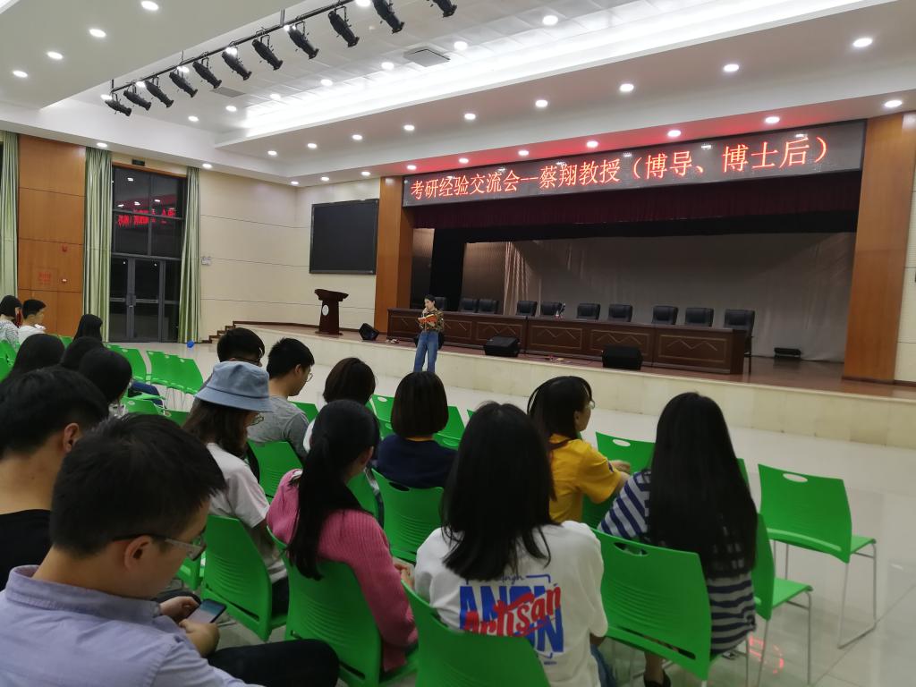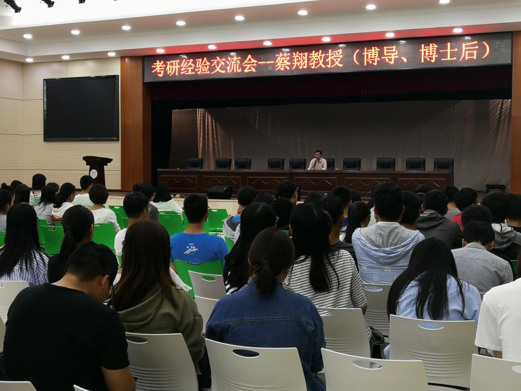 2018年4月18日晚7:00,管理学院就业与考研经验交流会于新食堂三楼学生活动中心举行,本次交流会由桂林电子科技大学博士生导师蔡翔教授进行主讲,九游手机平台管理学院党委副书记贺望林主持,出席本次交流会的有管理学院学工办主任王方俊、辅导员张力、14级考研录取学生代表以及15、16级有考研意向的学生。
