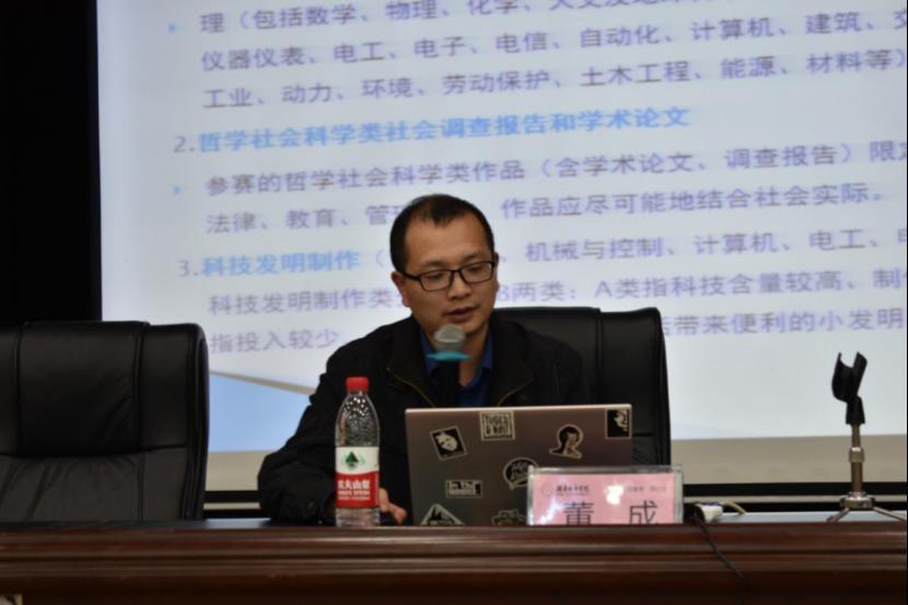 会议伊始,主持人简要地介绍了挑战杯比赛的具体流程,提出了参赛要求。接着是董成老师重点围绕如何参加挑战杯比赛进行讲解。首先,董成老师对“挑战杯”系列创新创业赛事做总体介绍,详细介绍了“大挑”和“小挑”,使学生对该比赛有了初步的了解。随后,董成老师对哲学社会科学类社会调查报告和学术论文、科技发明制作、自然科学类学术论文三个竞赛方向进行讲解,对选择研究方向、组建团队、撰写作品、佐证材料、现场问辩等步骤进行了详细的解读,也展示了在历年“挑战杯”赛事中我院学子所获奖项,为同学们参加“挑战杯”比赛指明了方向,同时也为更好地开展比赛打下了良好的基础。