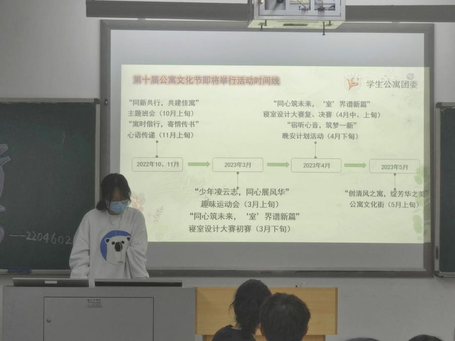 第三部分,主持人宣传了第十届公寓文化节,包括“寓时偕行,寄情传书”心语传递、“少年凌云志,同心展风华”趣味运动会等活动,感受快乐的大学生活。举办文化节活动也是为了丰富学生课外生活,活跃校园氛围,展示出新时代大学生的蓬勃朝气。