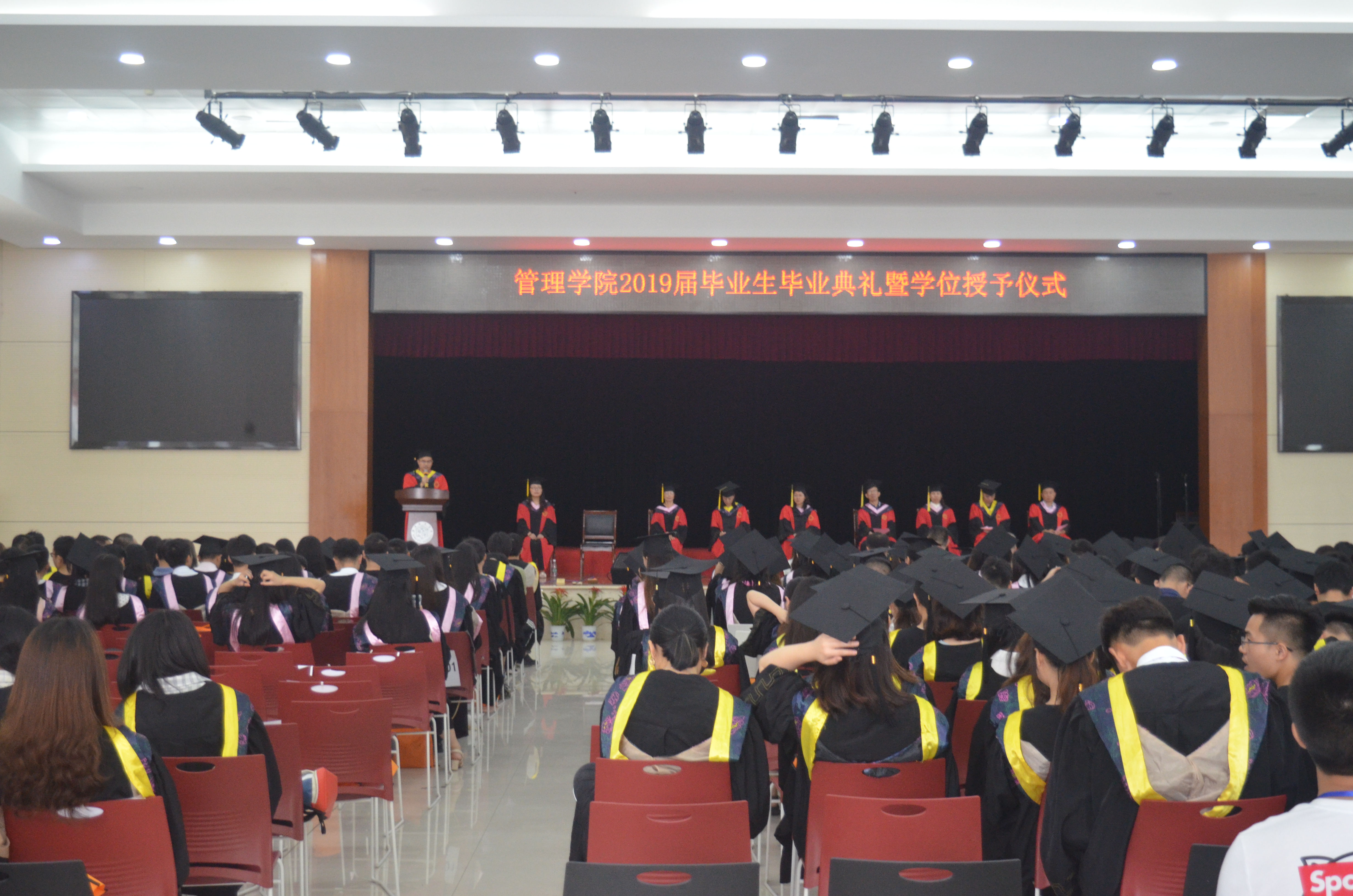 2019年6月19日,管理学院2019届毕业生毕业典礼暨学士学位授予仪式在学校学生活动中心举行,出席本次仪式的有管理学院院长孙倩教授,党委书记徐习军教授,党委副书记王润华教授、副书记蔡英杰老师,汤腊梅教授、薛姝教授、龙敬庭副教授、李双清博士、尹罡博士、周琼主任及全体辅导员老师。管理学院2019届全体毕业生准时到场与会。