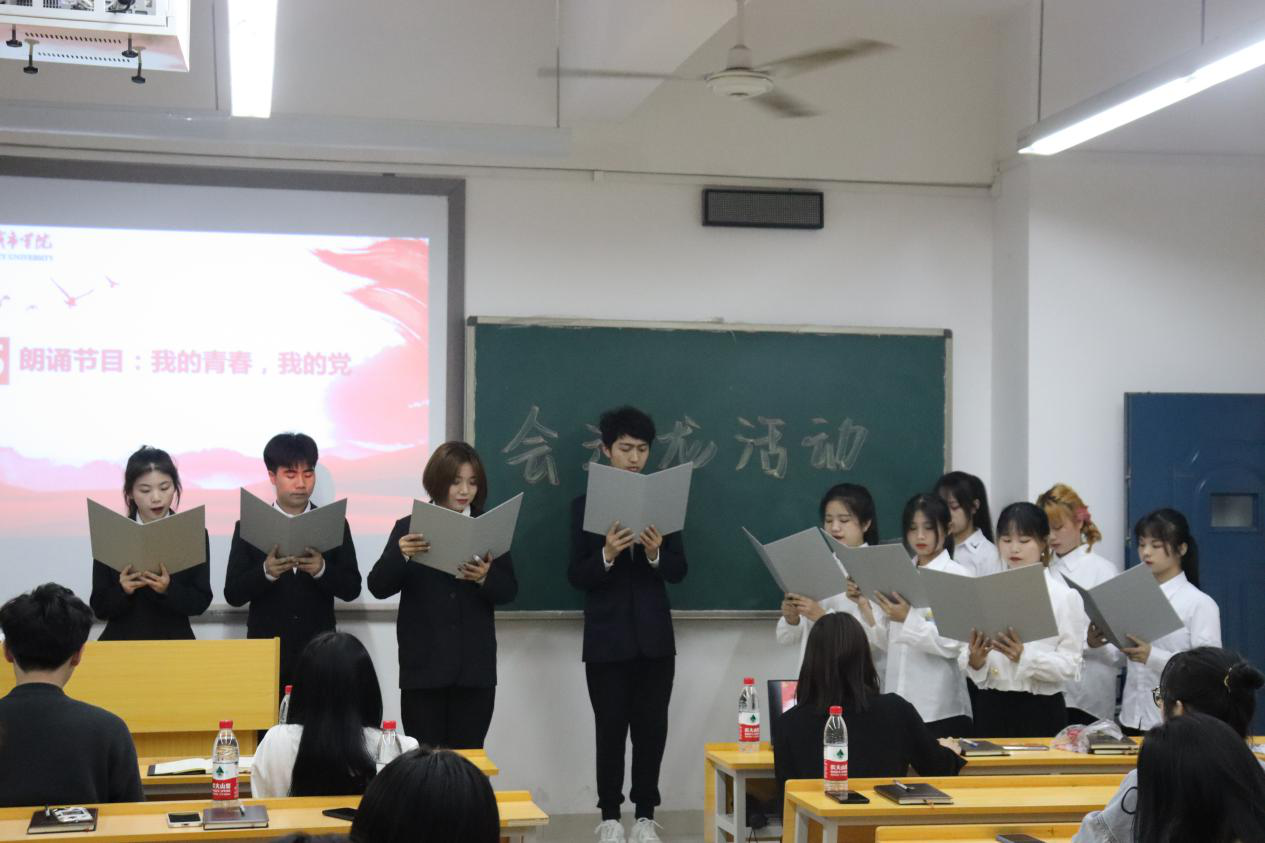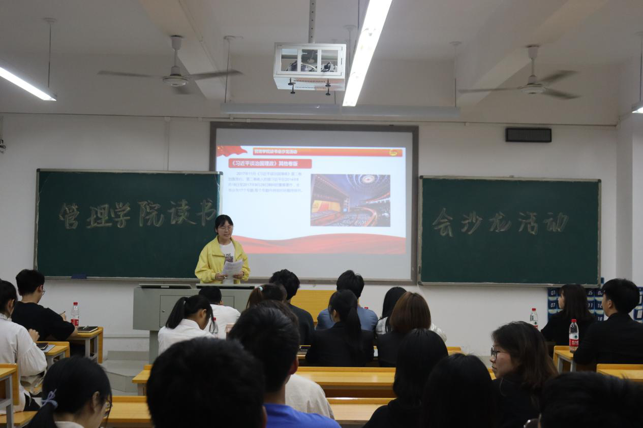 活动开始,主持人邓娇代表管理学院读书会向到场的嘉宾表示热烈的欢迎和衷心的感谢。本期读书会推荐的书籍为《习近平谈治国理政》,主持人分别从书目简介、写作背景、核心内容作了详细的介绍及这本书对世界的影响与启发。之后2004701班朗诵队给我们带来了“我的青春,我的党”的听觉盛宴。在问答环节,霍科成、陈胜杰、任添财、郑梦婷、喻雄宇、廖小丰同学积极给在座会员进行了解答。朱昊哲、喻雄宇、彭骞逸分享了他们对这本书的读书心得体会,他们一致认为这本书能使人强烈地感受到习近平新时代中国特色社会主义思想的人民性,感受到中国共产党人来自人民、依靠人民、服务人民的坚定不移与高度自觉,带有鲜明的人民立场、深厚的人民情怀、笃定的人民信仰。最后由会长罗荣威致总结辞,简述了推荐这本书的目的和意义,鼓励大家多读书、读好书,并向大家推荐了《红岩》《关于费尔巴哈的提纲》。
