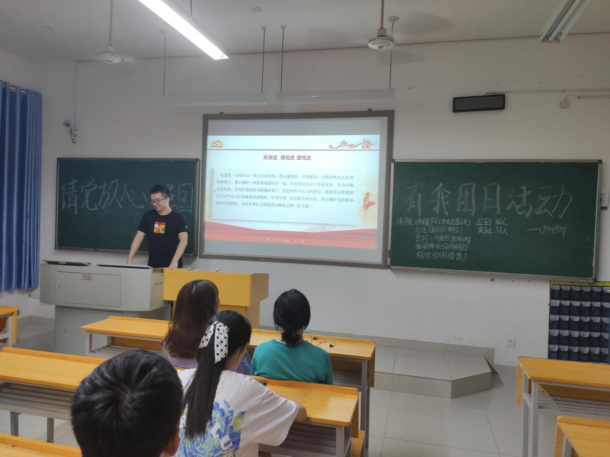 为了庆祝中国共产党成立100周年,深入学习习近平总书记“七一”重要讲话精神,响应党的号召,加强对于青年学生的思想政治引领,弘扬爱国主义精神,2021年9月25日,管理学院1904501团支部在管理楼203开展了主题团日活动。