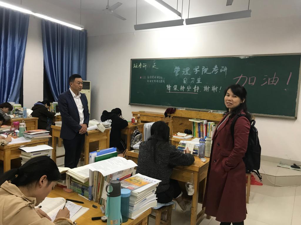 党委全体委员在管理楼考研自习室看望学生时,与学生深入交流并了解学生关于备考自习室配套设施的需求,她们表示希望各位同学卯足劲、加油干,紧紧抓住考研备考的关键时期,有目的、成系统的学习,预祝考研学生考出满意的成绩。