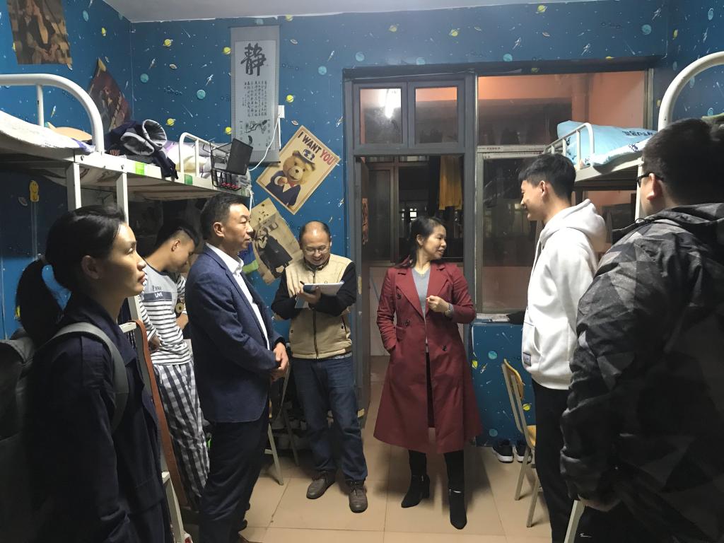院领导及班主任老师下寝看望学生时,密切关注寝室卫生环境、学习氛围,敦促寝室成员营造一个良好的学习环境,相互交流、相互监督、相互帮助以实现寝室成员的共同成长。