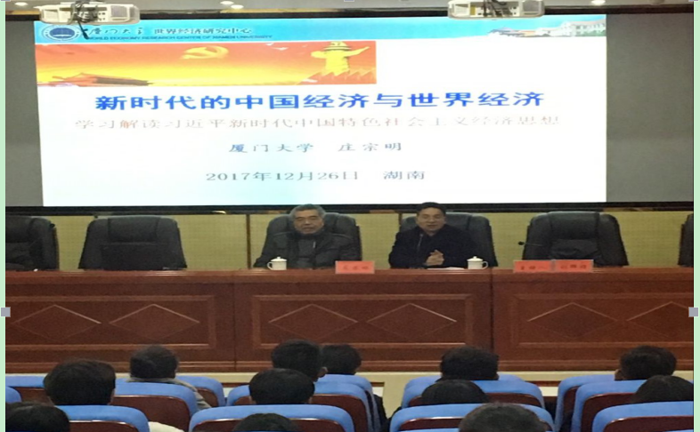 2017年12月26日,厦门大学经济学教授、博导,国务院学位委员会委员、学科评议组成员庄宗明教授在建规楼121学术报告厅做了题为“新时代的中国经济与世界经济”的学术报告。庄教授的报告联系十九大精神,分析了当前中国和世界经济形势,对我校管理学院教师的经济学教学和科研有着重要的指导作用。学术报告会后,庄教授与管理学院老师们亲切座谈,为老师们指导国家社科标书的撰写工作。九游手机平台副校长何振教授、刘辉煌教授先后主持会议,党委书记罗成翼教授现场接见了庄教授,衷心感谢庄教授传经送宝,希望庄教授大力支持学校的科研工作。