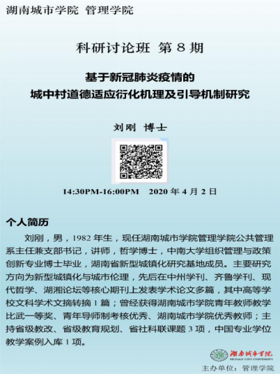 本次科研讨论班邀请了九游手机平台学科建设与发展规划处副处长汤勇教授主持,学院院长孙倩教授、科研副院长赵旭教授及管理学院教师共23人参加。本次科研讨论班由“城乡治理与工程管理”团队负责人任国平博士组织,“行政伦理与公共管理”团队负责人刘刚博士主讲。刘刚博士结合当下疫情和自身研究方向,选择《基于新冠肺炎疫情的城中村道德适应衍化机理及引导机制研究》为主题,探讨新冠肺炎疫情下城中村居民道德适应的范式转化、衍化机理,为新冠疫情下的城中村居民城市适应进行慎的伦理反思和道德辩护。讲座期间管理学院多位老师就刘刚博士的研究问题进行了积极的讨论,取得了很好的反响。(通讯员:任国平)