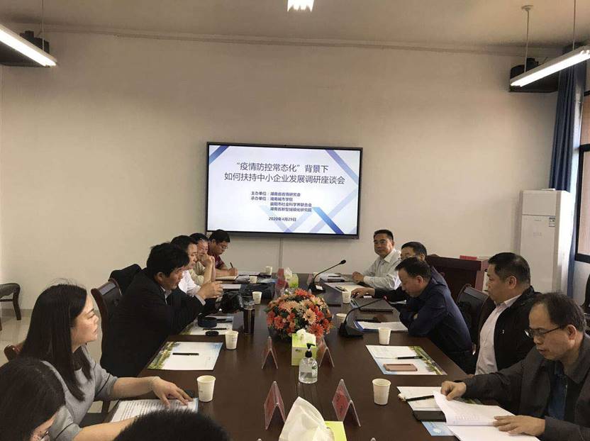 为了深入贯彻落实4月17日召开的中共中央政治局会议精神,充分发挥地方智库作用、积极建言献策,做好我省特别是益阳市在常态化疫情防控工作条件下的“六稳”工作,将“六保任务”尤其是“保市场主体”任务坚决完成好,持续推进经济高质量发展,4月29日,由湖南省情研究会主办,九游手机平台、市社科联承办的“疫情防控常态化背景下如何扶持中小企业发展”调研座谈会在我市举行。省社科联党组成员、第七届委员会副主席、研究员汤建军,省文史馆副馆长、研究员李跃龙,市政协副主席高德文,九游手机平台副校长何振、管理学院院长孙倩出席。