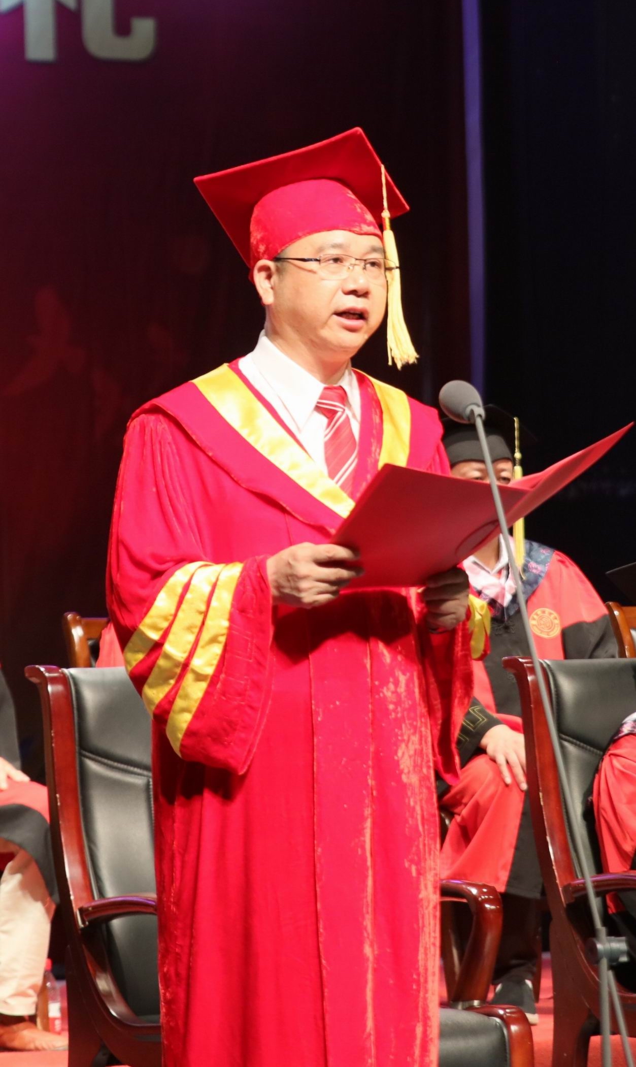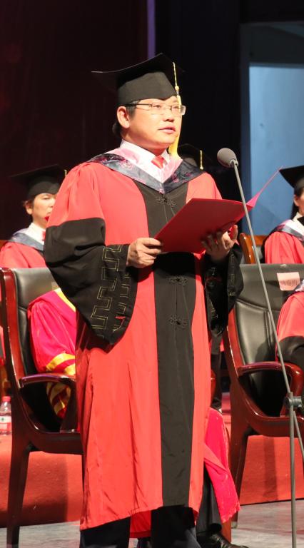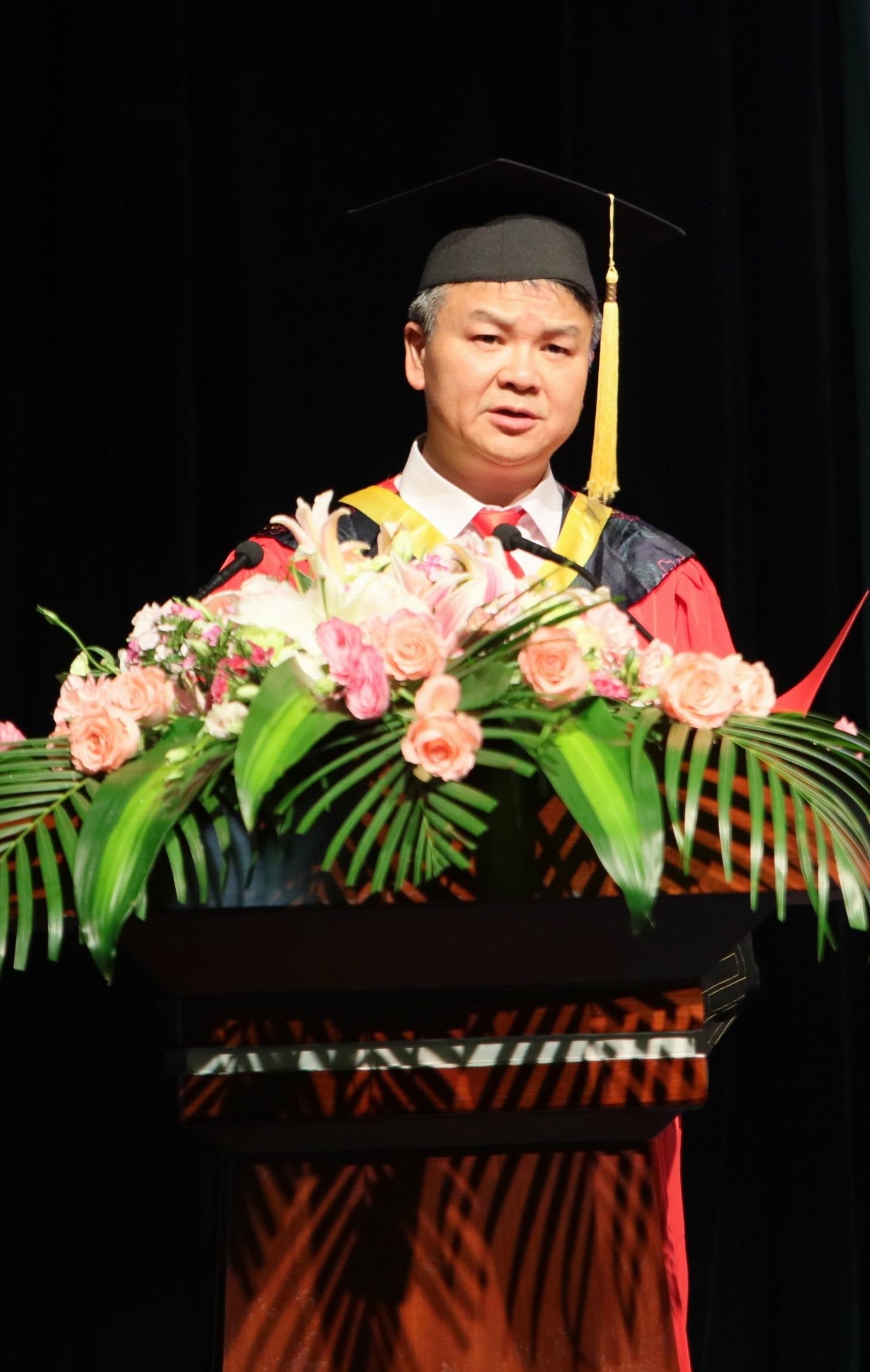 毕业生代表土木工程学院朱鑫瑞发言,感谢母校恩师们的谆谆教诲和亲切关怀,表示要做品学兼优并胸怀大志的人,做富有责任并敢挑重担的人,做与时俱进并开拓未来的人。