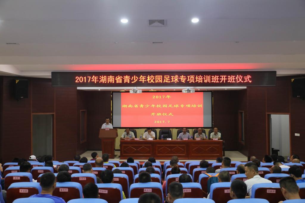 (本网讯)7月27日上午9:00,由湖南省青少年校园足球工作领导小组、省教育厅主办,我校承办的2017年省青少年校园足球中小学骨干体育教师培训在我校开班。副校长雷存喜、省青少年校园足球工作领导小组办公室专员王冬冬、益阳市教育局体卫艺科科长张伟、体育学院领导班子成员、培训班教师团队、班主任及工作人员等出席了开班仪式。