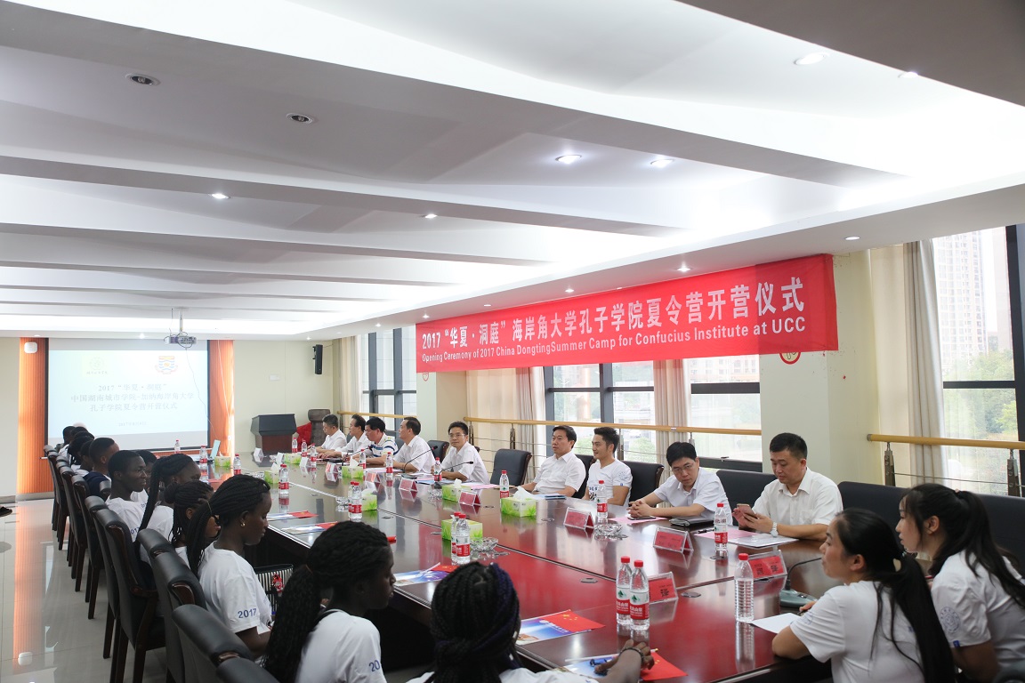 (本网讯)8月5日下午,由国家汉办/孔子学院总部主办,我校承办的2017“华夏·洞庭”海岸角大学孔子学院夏令营在我校开营。副校长刘辉煌、雷存喜,益阳市外事侨务旅游局副局长张金龙,学校教务处、保卫处、国际合作与交流处、人文学院等相关负责人,夏令营领队老师胡亮才以及来自加纳海岸角大学孔子学院的14名营员参加了开营仪式。