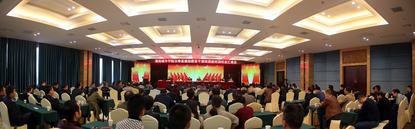 (本网讯)10月20日下午,由我校继续教育学院承办的汉寿县规划建设干部培训班在汉寿县龙阳国际大酒店多功能厅举行了专业设计公开答辩暨结业典礼。校长李建奇、党委副书记汤放华、副校长夏宏宇,汉寿县委书记杨昶、副书记刘毅翔、县委常委宣传部长黄治军、县委常委组织部长李芳、县委常委常务副县长丁克刚、县人大副主任陈武俊、副县长彭华、副县长宋万林、县政协副主席黄启顺,继续教育学院相关负责人、答辩专家组成员以及汉寿县城建规划系统负责人、部分职工及全体学员参加典礼。