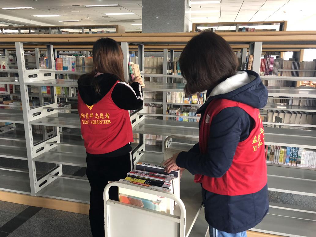 志愿者整理图书馆书籍