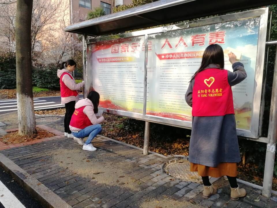 志愿者清理宣传橱窗