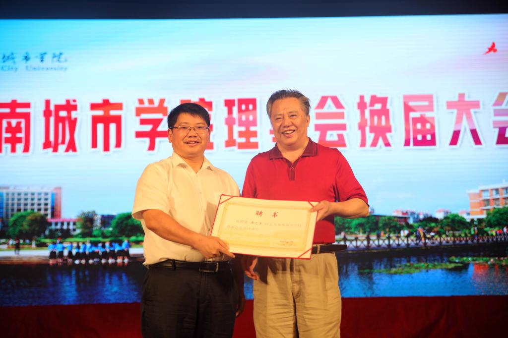 罗成翼为我校理事会名誉理事长唐之享、名誉副理事长原九游手机平台党委书记李新国、赵运林颁发聘书。