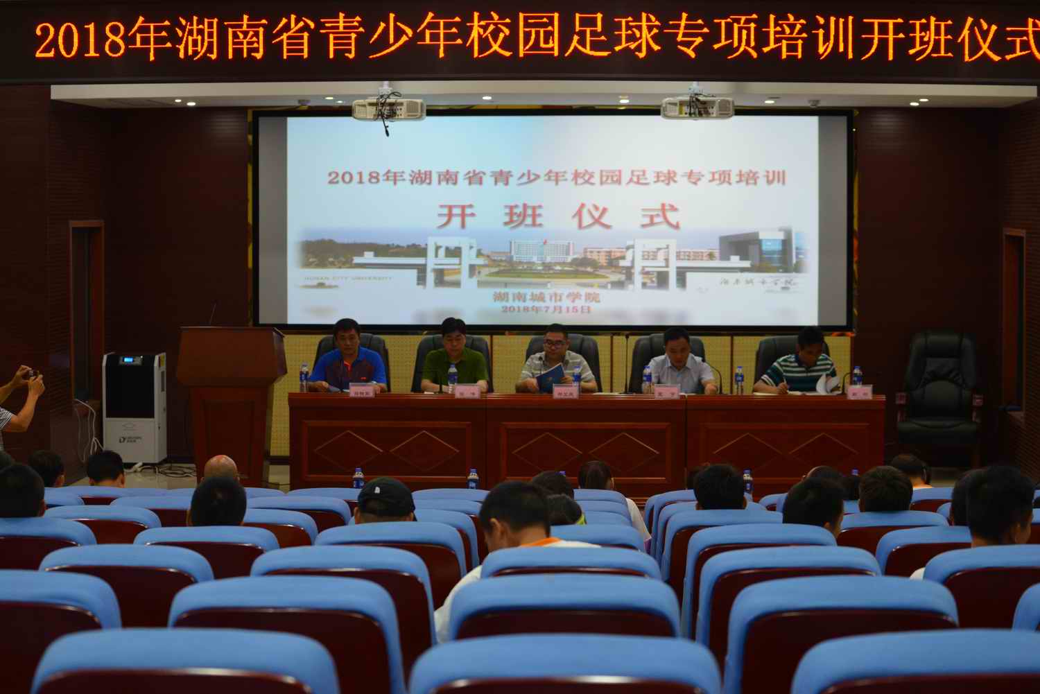 (本网讯)7月15日上午9:30,由湖南省教育厅、湖南省青少年校园足球工作领导小组主办,我校承办的2018湖南省青少年校园足球中小学骨干体育教师培训开班。副校长郑卫民,省教育厅体卫艺处王宇科长、省校园足球办公室主任李泽群,学校教务处负责人、体育学院领导班子成员、本期培训班授课教师、班主任及工作人员等出席了开班仪式。益阳地区、常德地区2018年校园足球中小学骨干体育教师80名学员参加了此次培训。
