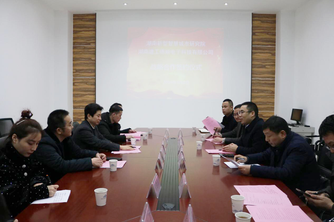 (本网讯)2019年1月8日下午,我校与湖南建工德顺电子科技有限公司(以下简称建工德顺)战略合作协议签约仪式在创新创业楼二楼会议室举行。省建工集团党委副书记陈克军、建工德顺董事长谢建华及部分公司高管,副校长谭献良、智慧城市研究院相关负责人出席签约仪式。签约仪式由智慧城市研究院院长李梦醒主持。