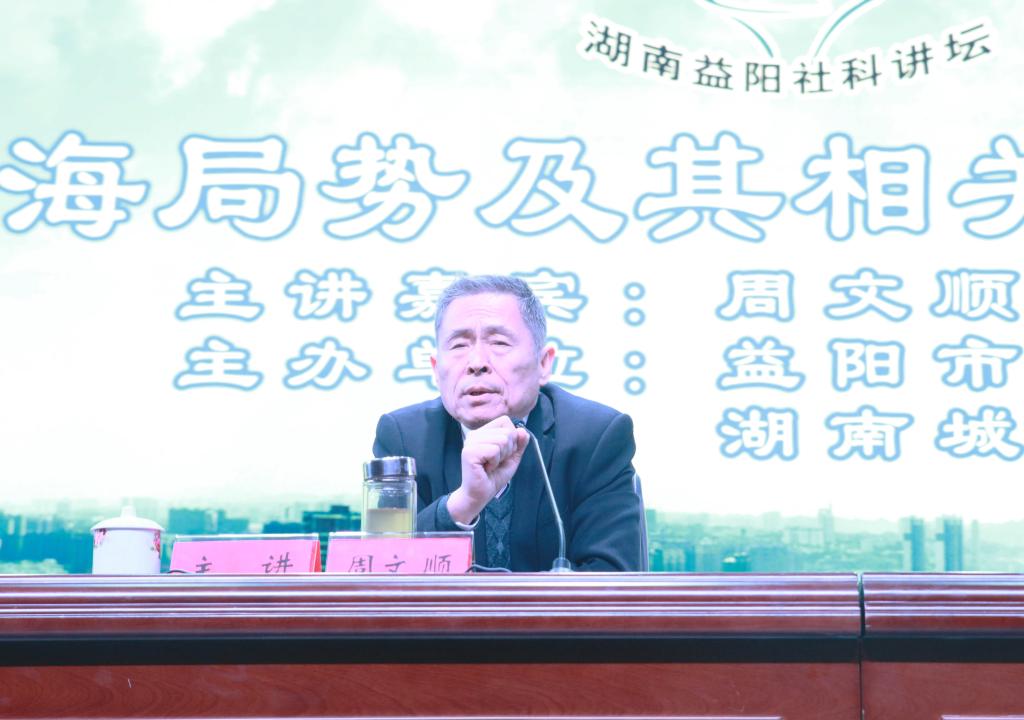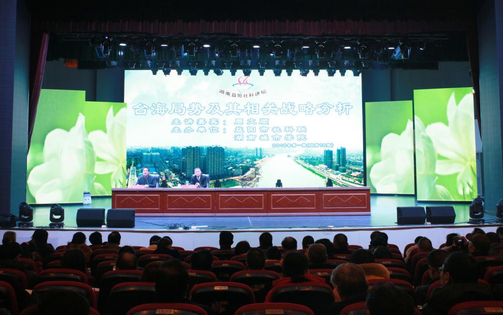 (本网讯)2019年2月27日,郑州大学周文顺教授应邀在我校音乐厅作了一场题为“台海局势及其相关战略分析”的专题报告。报告会由益阳市社科联主席周志宏主持,副校长何振和我校200多名师生以及益阳市130多名社会科学工作者到场聆听。