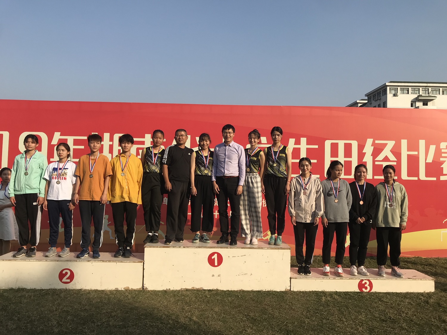 本网讯2019年11月7日—10日由湖南省教育厅主办的2019年湖南省大学生田径比赛在湖南师范大学举行,我校共派出了22名男、女田径健儿参赛,经过奋勇拼搏,最终斩获了14枚奖牌,其中金牌4枚,银牌5枚,铜牌5枚。