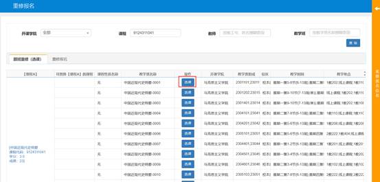 高等数学A(1)、线性代数(线性代数A)、大学生计算机基础等课程为“单开班重修”,选择相对应的教学班,点击选课,根据提示操作。